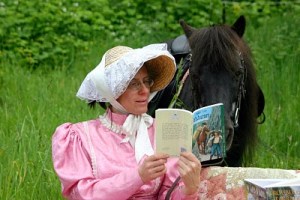 I’ve spent the last couple of hours searching for any photos of mountains in winter that I might have lurking on my hard drive (needed for a project I’m working on)… Because my filing system leaves something to be desired, this means I’ve been scrolling through about 50,000 or so images – my head is about to explode! But along the way, I’ve stumbled on a few random photos I’d totally forgotten about including this one of me in a cupcake pink dress and bonnet (!!) reading one of my books to the lovely Miss Emma. Emma is no longer with us, alas, but I have quite a charming set of photos of the pony reading various horsey books…