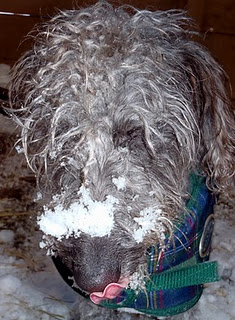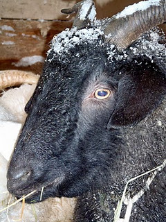 Nosmo and King (the Kashmir goats) have such a thick layer of soft insulation that the snow takes forever to melt even after they come inside the barn. Mind you, the goats are far less likely to venture outside in inclement weather. This afternoon, they saw me coming with the hay and decided to trot out into the blizzard to meet me at the gate.