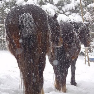 I have no idea what my ponies enjoy about standing around outside when the snow starts flying. Even though they have access to shelters, their thick double coats seem to provide enough protection that they often prefer to brave the elements than stay sensibly inside. That’s Bonny to the right and Brio closer to the camera. Note that Brio has inherited her mother’s glorious broad rump.