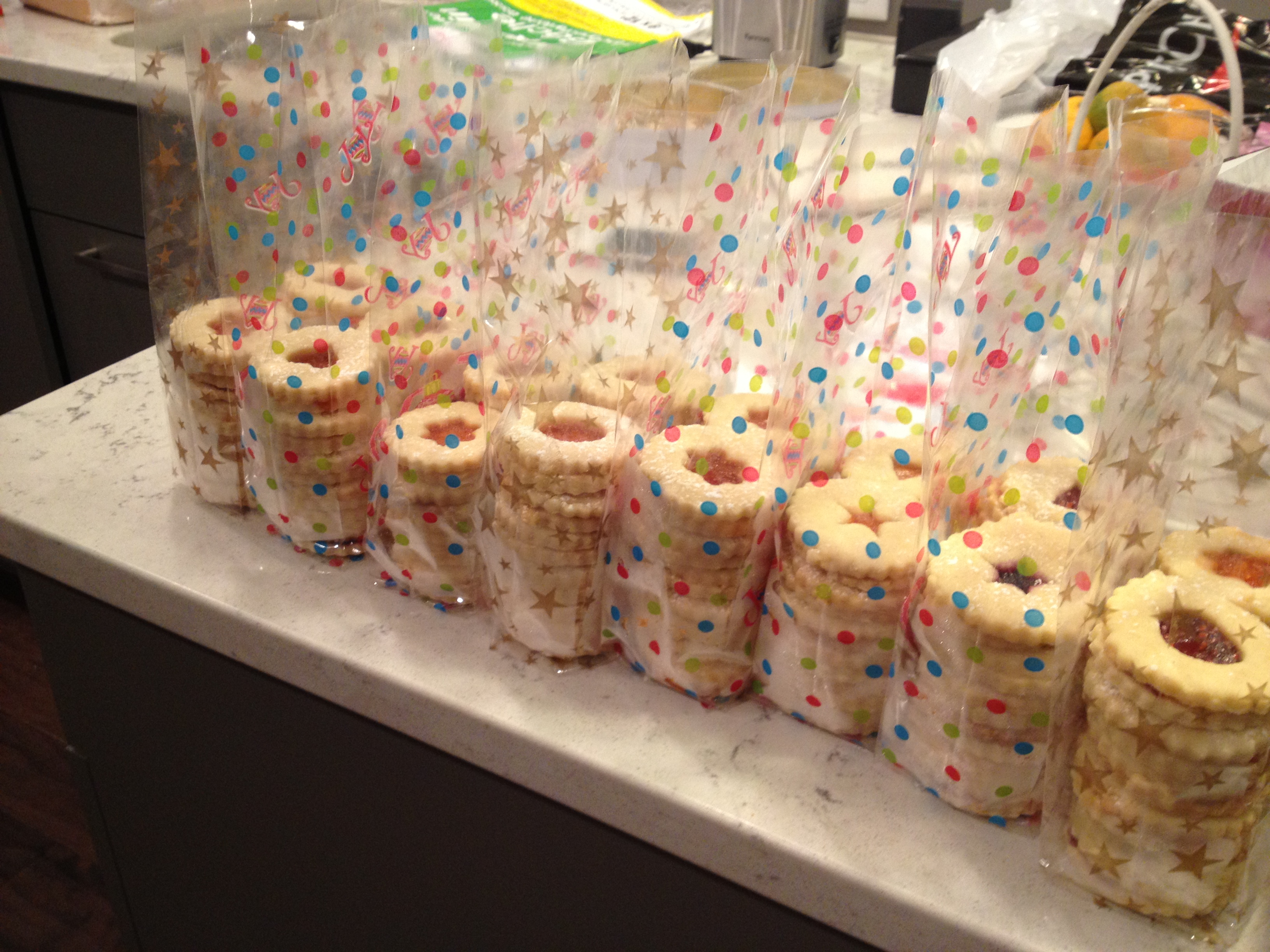 Each person who came to the cookie swap brought a baker’s dozen dozen cookies… We then mixed and matched and each left with a dozen each of a dozen different kinds of cookies. The extra dozen of each variety was set out for testing… Yum! These were Dani’s sugar and homemade jam delights… I made chocolate dipped macaroons which are guaranteed to transport me back to my childhood when my Omi used to make them as a special treat at this time of year.
