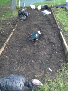 When I start clearing out a bed, it doesn’t take long for volunteers to come along behind me to clear out slugs and other undesirables. This is one of last year’s hugel beds, to which I’ll add a bit of compost before planting some garlic. I’ll mulch with a mix of hay and goat droppings from the goat pen and then sit back and wait for spring. Ah, garlic scapes…