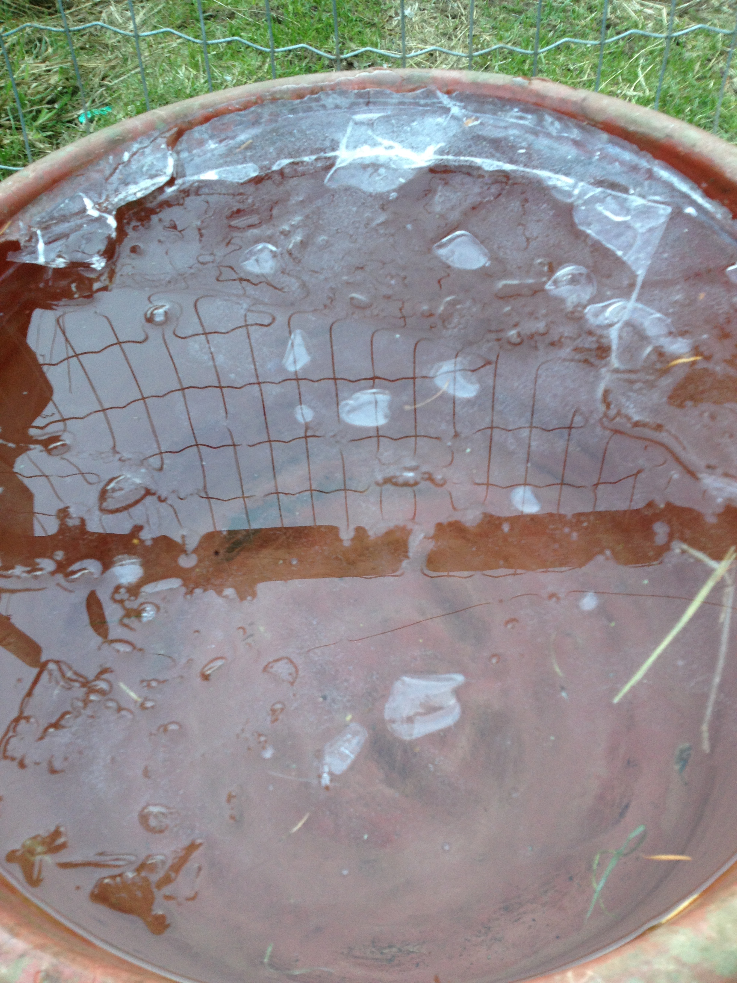 The water needs to be hot because the second problem that develops is the water in the various buckets and tubs freezes. When it isn’t seriously cold, it isn’t hard to smash through the layer of ice on top to get to open water below. When it stays cold for several days or when the temperatures plunge, the layer of ice is too thick to break.