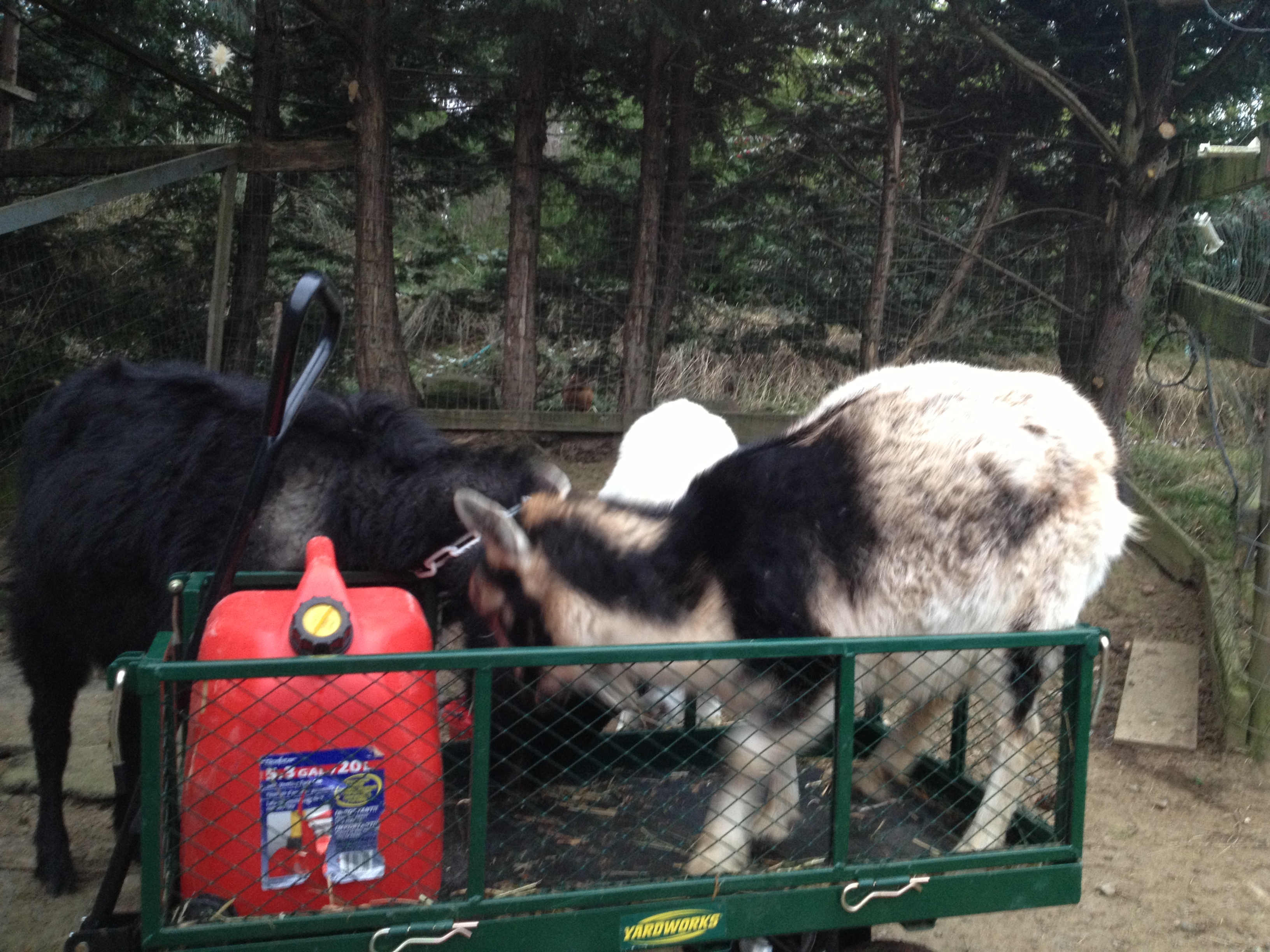 The other thing that I found a bit surprising was how challenging it was going to be to navigate my way through the goat pen with the cart. I know better than to attempt such a maneuver with goodies in the cart, but coming down through the goat pen with a couple of water jugs shouldn’t have been a problem. Those goats can sniff out a spilled morsel of any sort of grain or seed or fleck of carrot from fifty paces. They charge the cart and surround it, oblivious to my shouts and threats.