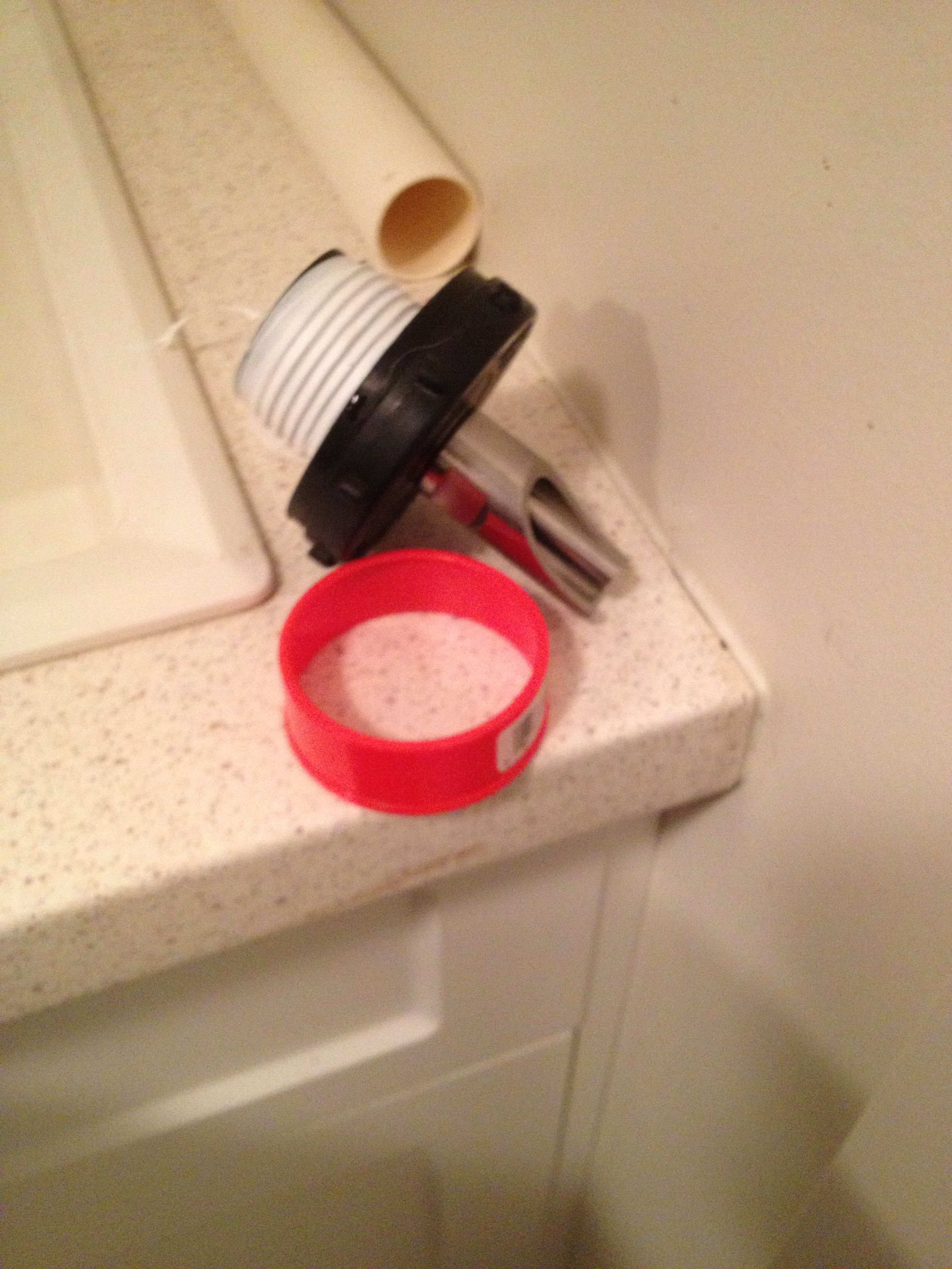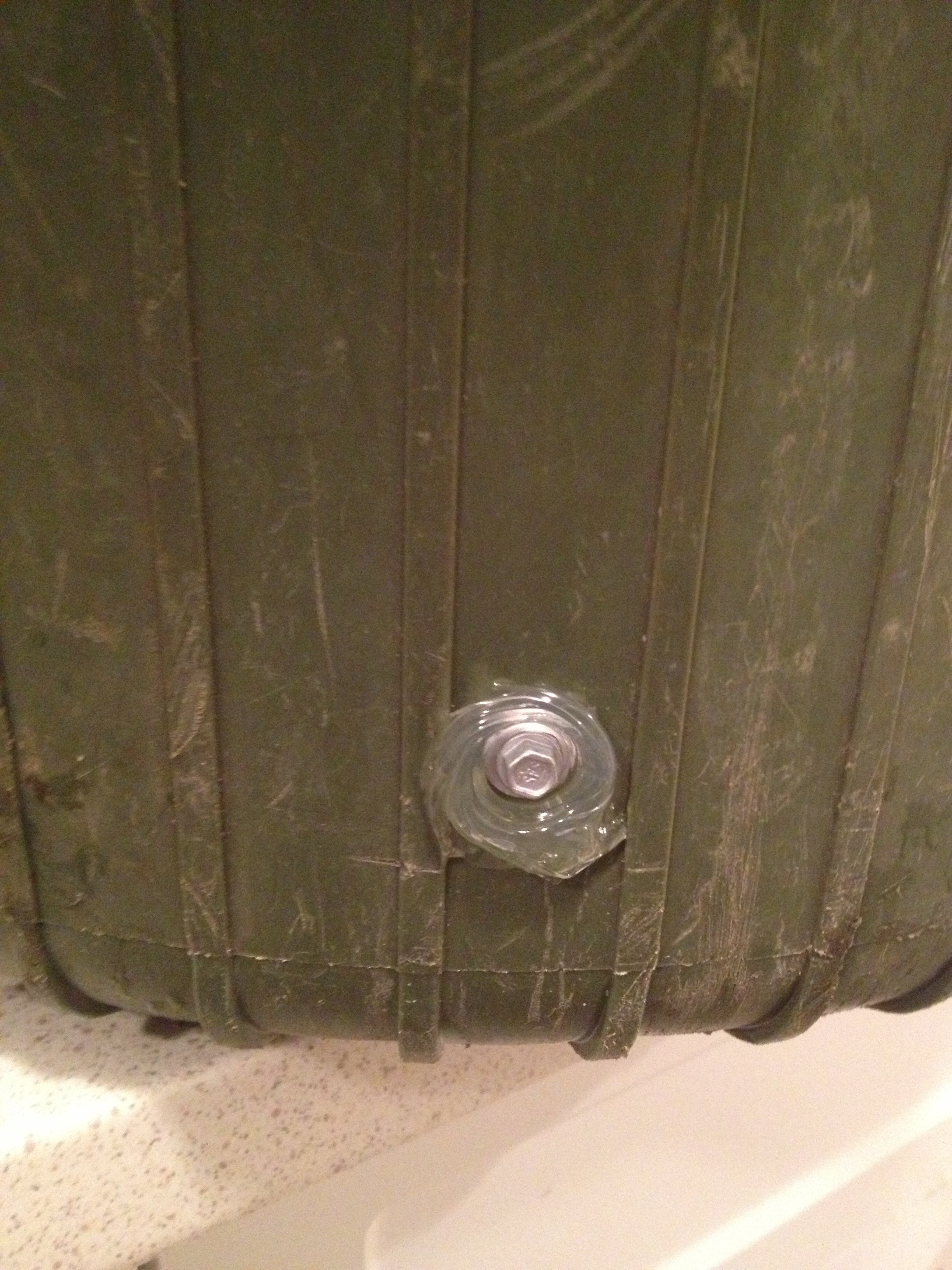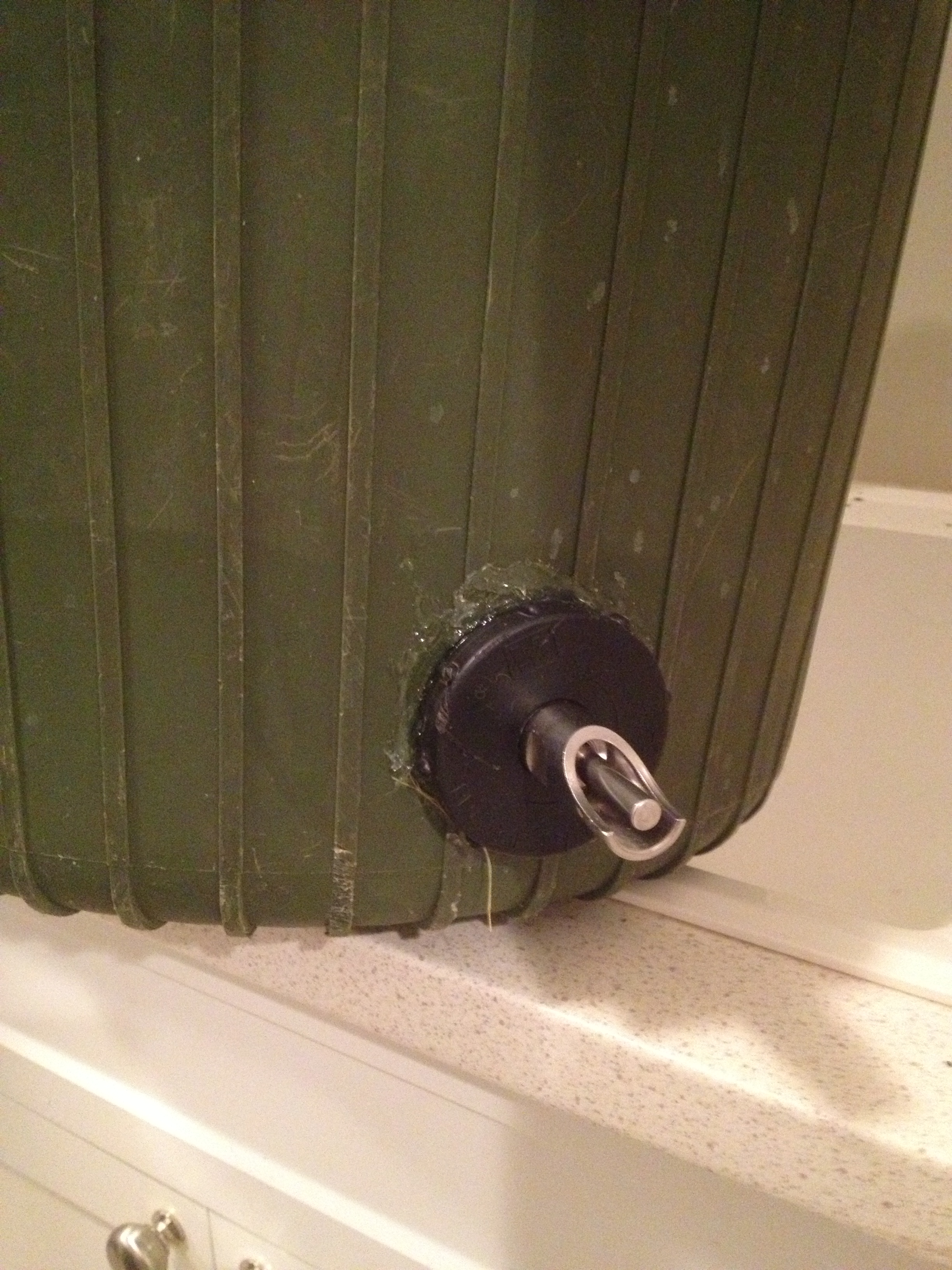 Dad and I set about installing what appeared to be a pretty simple set-up. We wrapped all the relevant threads in plumber’s tape, drilled a big hole in the side of the plastic garbage can, and then proceeded to fasten all the bits together. We screwed the hog nipple into Part A, put Part A a on the outside of the garbage can and then threaded Part B onto Part A, but inside the garbage can, sandwiching the wall of the can between the two parts. Sounds ludicrously complicated but was actually very simple.