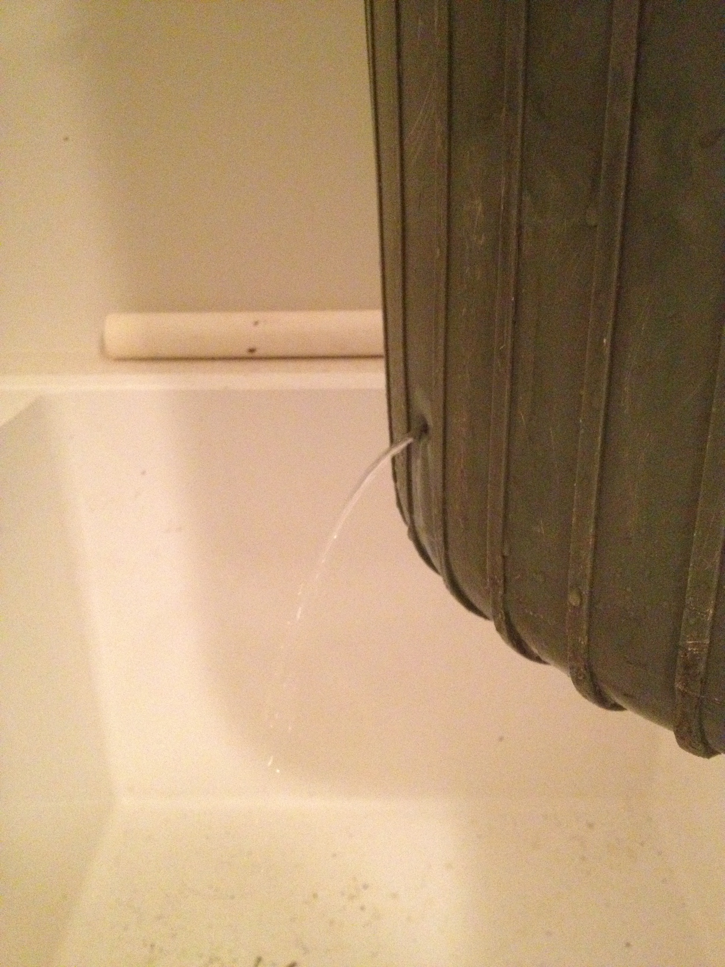 We repeated the water test and… noticed that the water level was dropping even more rapidly. Not only that, there was the distinctive sound of water dribbling… A closer inspection revealed that the problem had nothing to do with the nipple installation but everything to do with a nail-sized puncture wound on the back side of the garbage can!