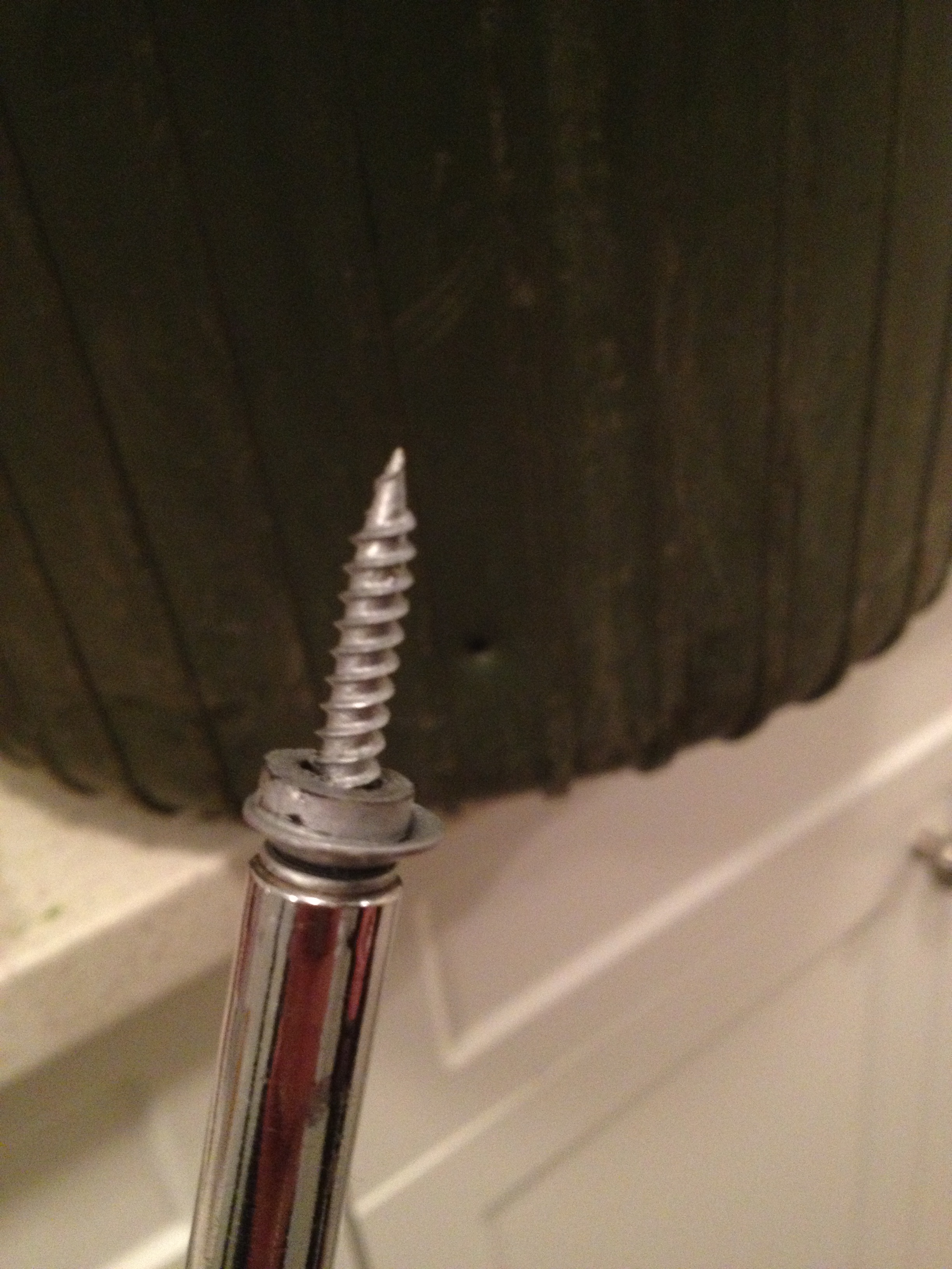 In a flash of inspiration Dad thought of roofing screws which are backed with a built-in rubber washer. We found one, slathered it with Roof Patch goop, and screwed it (gently) into the hole.Roofing screw to the rescue!Roofing screw to the rescue!Our improvised version of a pot mender in position. Our improvised version of a pot mender in position.