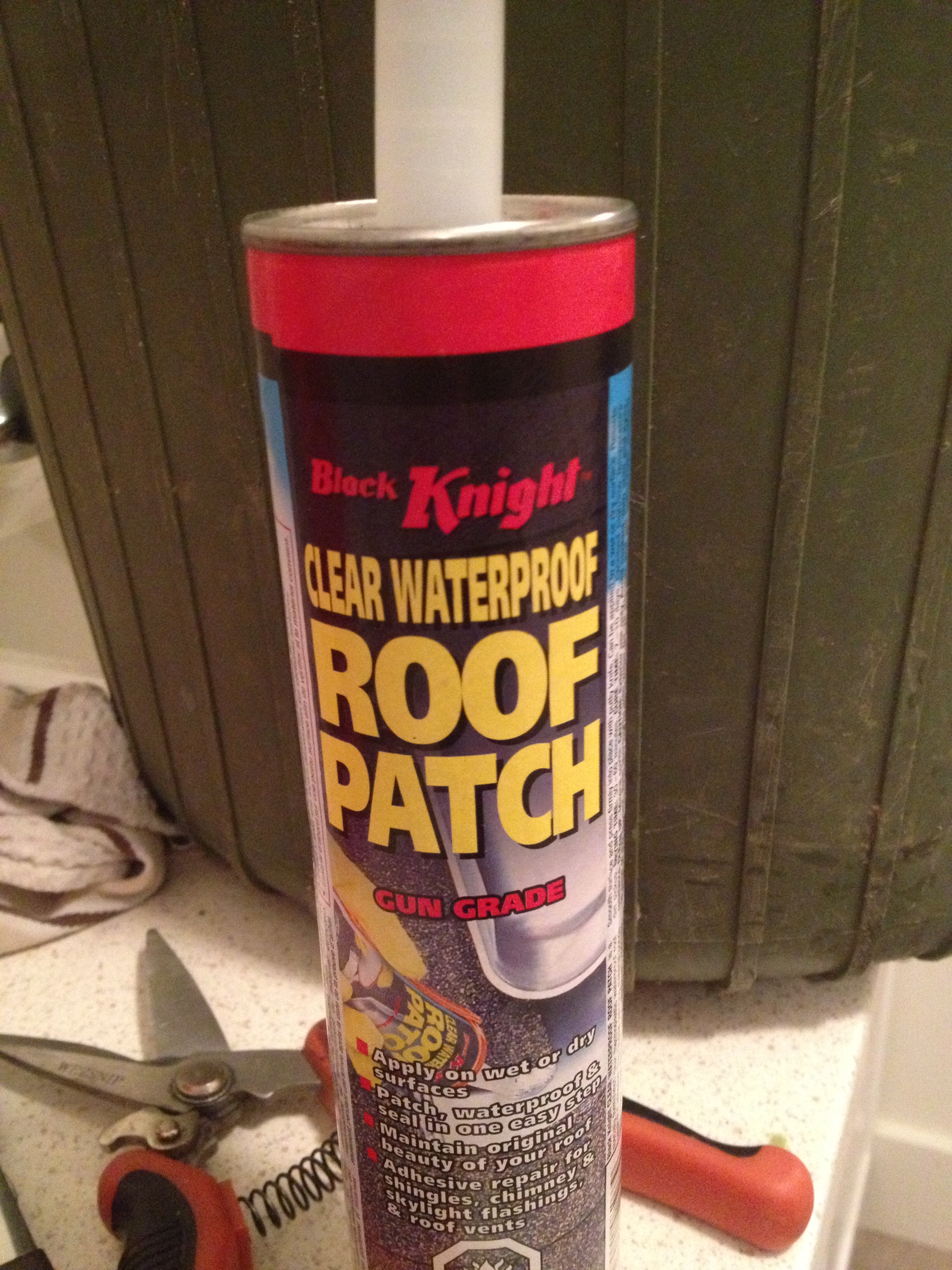 Roof Patch goop – can be applied wet – guaranteed to stop leaks. We also added more plumber’s tape for good measure.