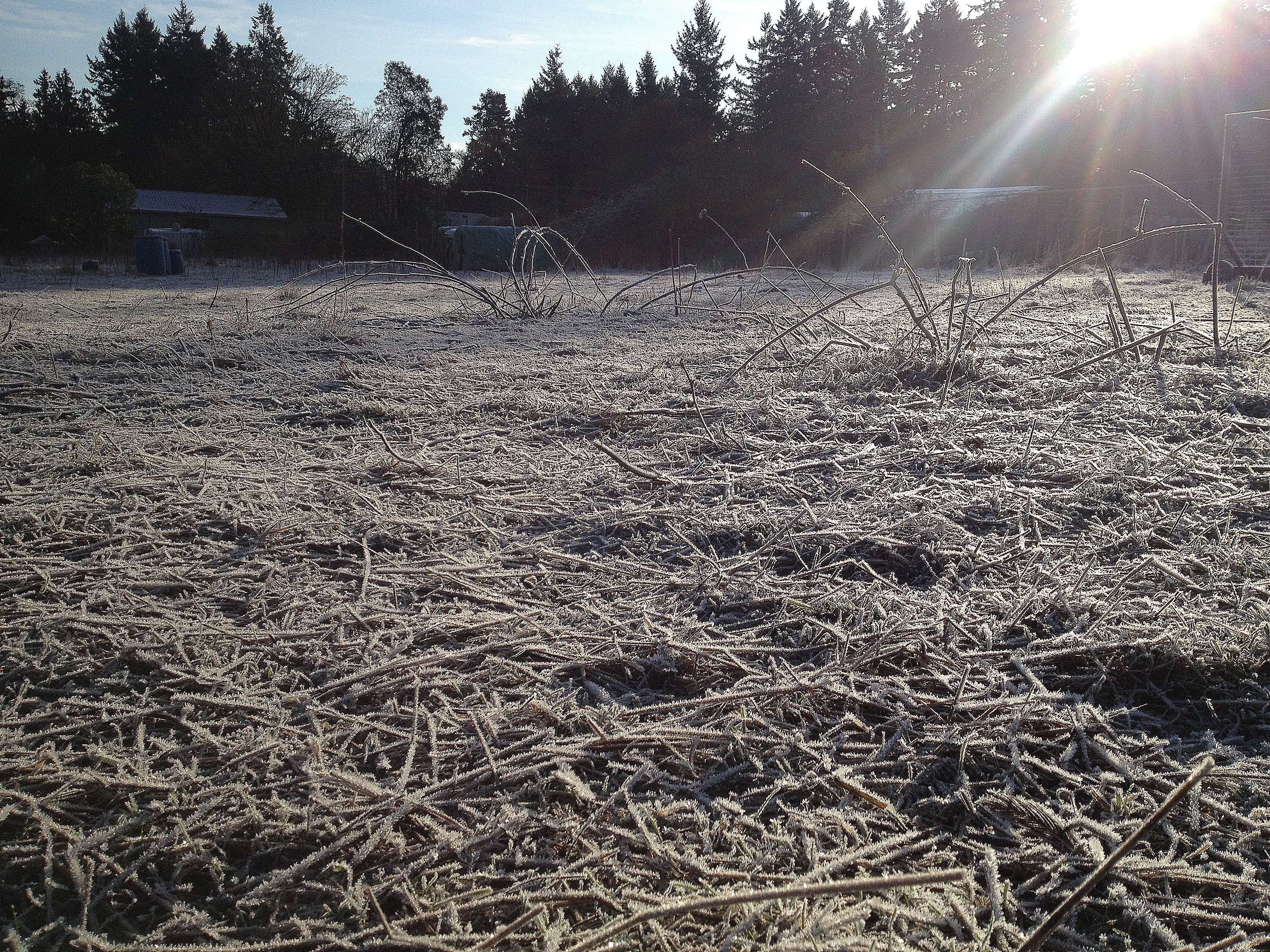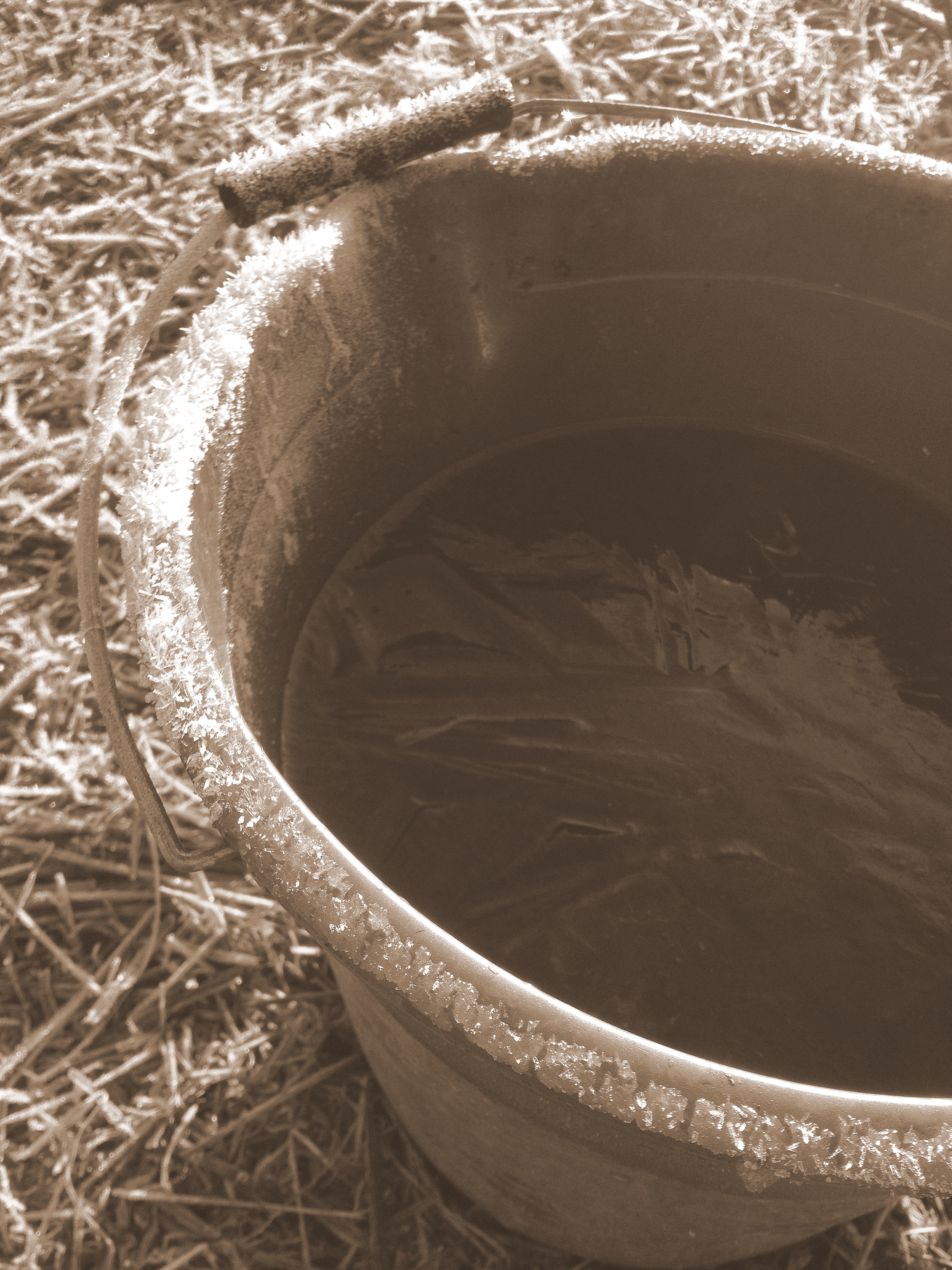 A half full sort of geographic feature when you are standing on top of the hill surveying the amazing view we enjoy, but a half empty bump in the road when you are slithering down it trying to hold back the cart loaded with VERY HEAVY containers of hot water because the hill is a) steep and b) frosty and you realize as you are about to hit a fence post because the cart has developed a mind of its own and is determined to plow you over and send you arse over tea kettle into the goat pen but there’s no way you are going to let go of the cart because then it would tip over and the cans would fly out, probably shatter in the cold, and then you’d have to make a trip to Canadian Tire to replace them with better, stronger versions so you can return to the laundry room sink, refill, and try again. I don’t think that last bit was in any way grammatically correct, but who thinks of grammar at times like that?