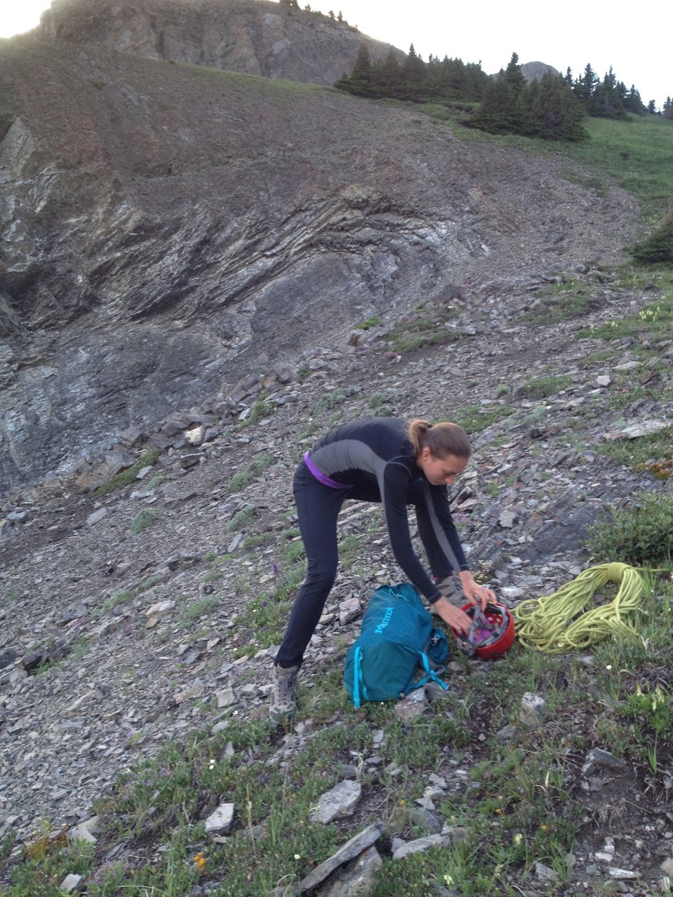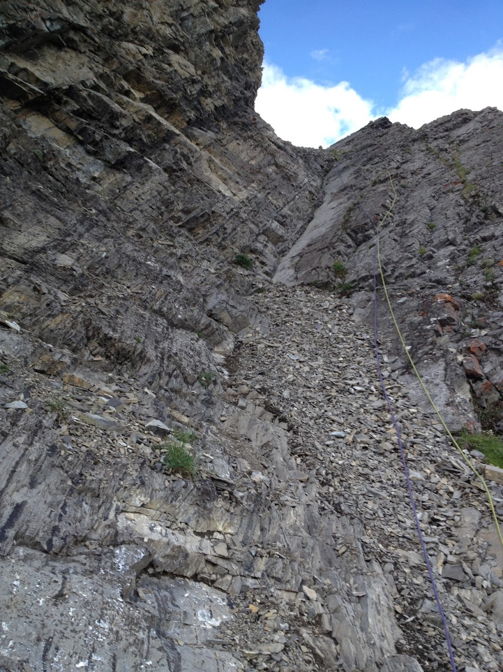 Had serenity and a pleasant stroll back down to the parking lot been the end of this expedition, well, I could have wrapped up this blog post right about now. But the next section was what they call a ‘challenging scramble’ which, translated, means, “You have got to be kidding!” At this point the other two really put me to shame, marching along a narrow goat track, seemingly oblivious to the kilometre (? I’m not exactly sure of the distance, but that’s probably not so far off) drop just to our right. At some point Fabio decided it was best to short rope one section, a technique where the leader basically puts the followers on a short leash so that if he feels one of us losing our balance he can lean against the wobble and help the vertiginous regain equilibrium. To me, this seemed like a good way for a wobbler to pull all three people off the mountain in one fell swoop as he was not actually fastened to the mountain by anything more than experience and the sure-footedness of a mountain goat.